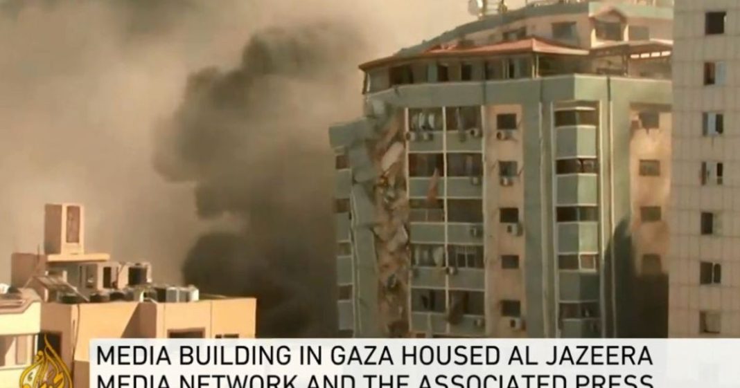 Um prédio de 12 andares na Faixa de Gaza que abriga os escritórios da agência de notícias Associated Press (AP), dos Estados Unidos, e da emissora de televisão Al Jazeera, do Catar, desabou neste sábado (15) após ser atingido por mísseis israelenses. As informações são do portal G1, da Reuters e da France-Press.